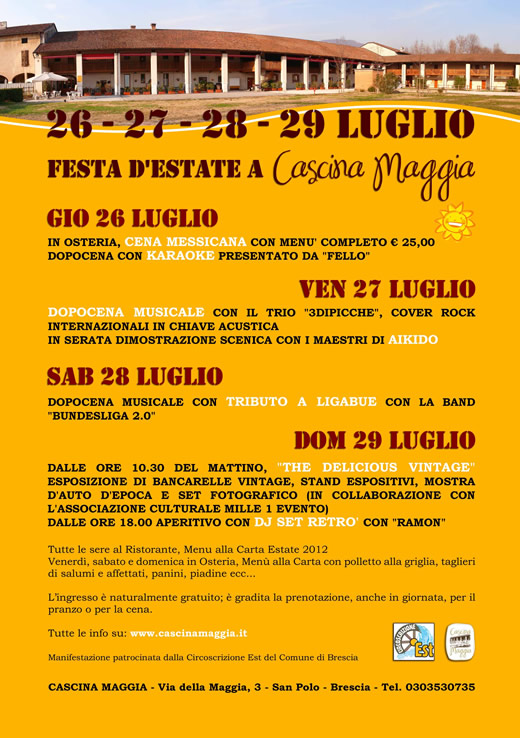 Presso la Cascina maggia a Brescia in programma dal 26 al 29 Luglio 2012: Mille 1 Evento. Per maggiori informazioni consulta il sito www.cascinamaggia.it