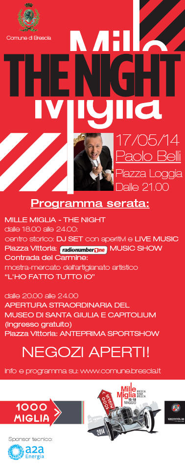 Sabato 17 Maggio 2014 a Brescia nel centro storico in attesa del rientro delle vetture in gara i festeggiamenti hanno il loro culmine con la notte bianca Mille Miglia – The Night  la festa della città dedicata allo storico evento automobilistico.