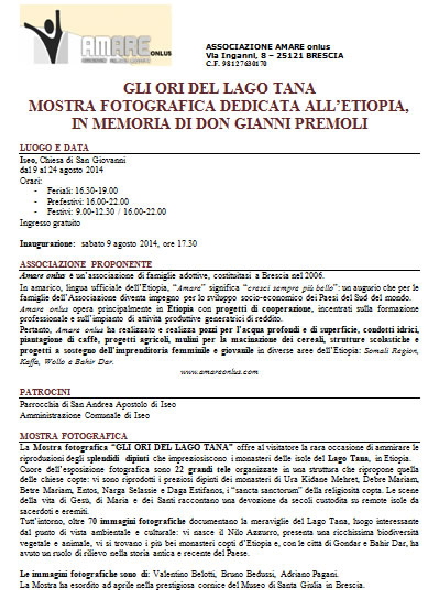Dal 9 al 24 agosto 2014 presso la Chiesa di San Giovanni a Iseo verrà esposta la Mostra Fotografica dedicata all’Etiopia, in memoria di Don Gianni Premoli. L’inaugurazione è prevista per sabato 9 agosto 2014, ore 17.30 Ingresso gratuito