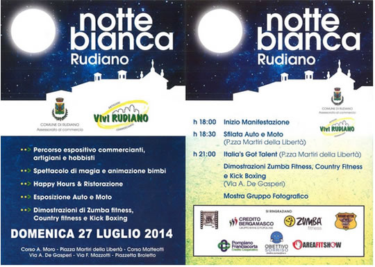 Domenica 27 luglio 2014 dalle ore 18.00, presso via Mazzotti 16 a Rudiano, Notte Bianca. Il programma prevede: esposizione auto e moto, spettacolo di magia, ristorazione e dalle ore 21.00 gli Era Ventuno suoneranno insieme agli FuzzuF a suon di Rock
