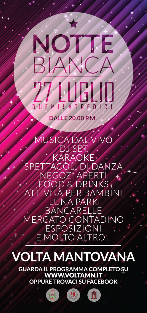 In programma per Sabato 27 Luglio 2013 la notte bianca a Volta Mantovana dalle ore 20. musica dal vivo, dj set, karaoke, spettacoli di danza, negozi aperti, bancarelle, attività per bambini, food and drinks, mercatino contadino, esposizioni e molto altro… Per maggiori informazioni e programma completo www.voltamn.it