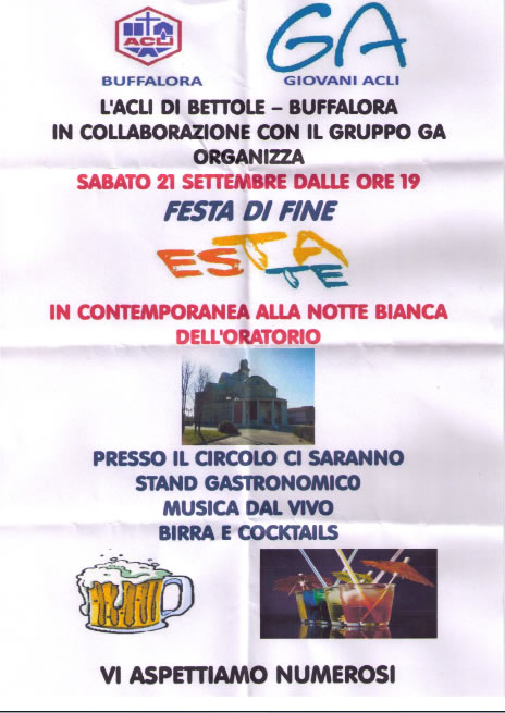 Sabato 21 settembre dalle ore 19,00 Buffalora ci propone 2 eventi: la Festa di Fine Estate organizzata dall’ Acli Bettole/Buffalora con il Gruppo GA e la Notte Bianca in Oratorio, in programma musica dal vivo e stand gastronomico con birra e cocktails