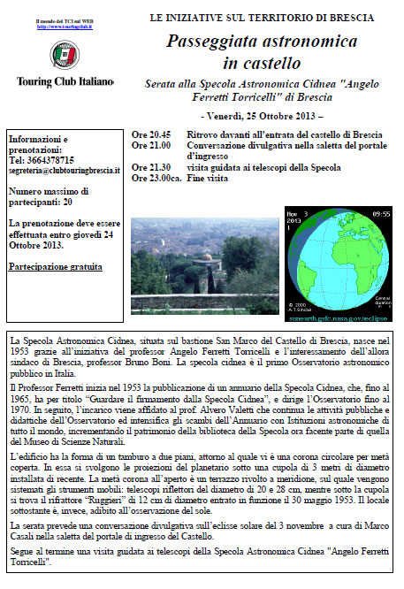 Venerdì 25 ottobre le iniziative sul territorio di Touring Club propongono la Passeggiata Astronomica in Castello, il ritrovo è per le ore 20.45 davanti all’ entrata del castello e dopo una conversazione divulgativa nella saletta del portale d’ ingresso la visita guidata prosegue verso i telescopi della Specola Astronomica Cidnea