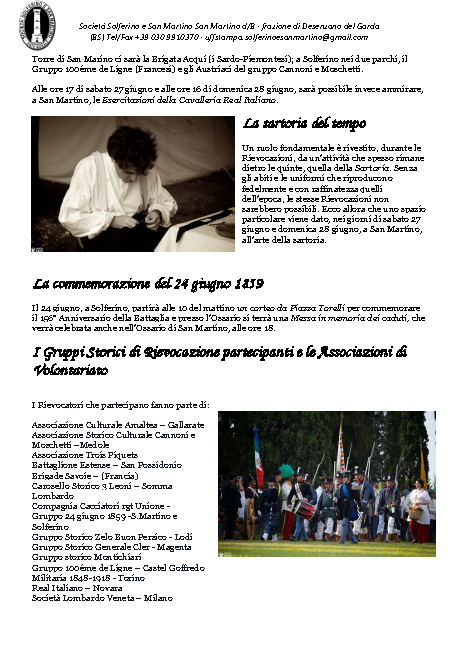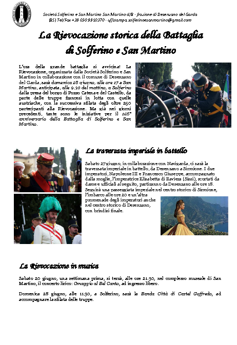 Venerdì 26, sabato 27 e domenica 28 giugno 2015 torna La Rievocazione storica della Battaglia di Solferino e San Martino. Due giornate, due luoghi storici, che faranno rivivere la grande Battaglia del 24 giugno 1859
