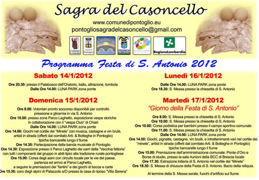 Il Comune di Pontoglio presenta l’edizione 2012 della sagra del casoncello, in programma dal 4 al 17 Gennaio 2012. Per maggiori informazioni consultate il sito ufficiale www.comunedipontoglio.eu.
