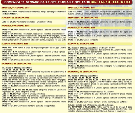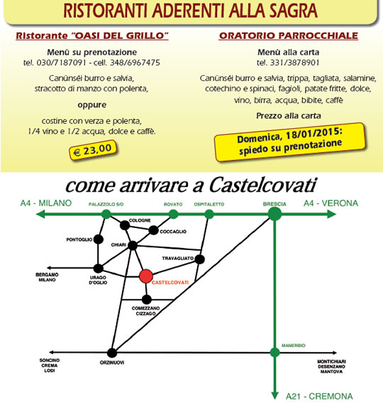 La Parrocchia e l’Amministrazione Comunale per il settimo anno consecutivo in onore di Sant’Antonio Abate patrono di Castelcovati propongono la Sagra I Canusei de Sant’Antone. La festa patronale in programma da martedì 6 a domenica 18 gennaio 2015, diventa un’opportunità significativa per mantenere viva l’identità e rinverdire la memoria collettiva del paese, nelle sue migliori tradizioni culturali, sociali, artistiche e folcloristiche. Si intende valorizzare la gastronomia tipica covatese attraverso la promozione della ricetta più genuina e rap “canunsèi de Sant’Antone”.