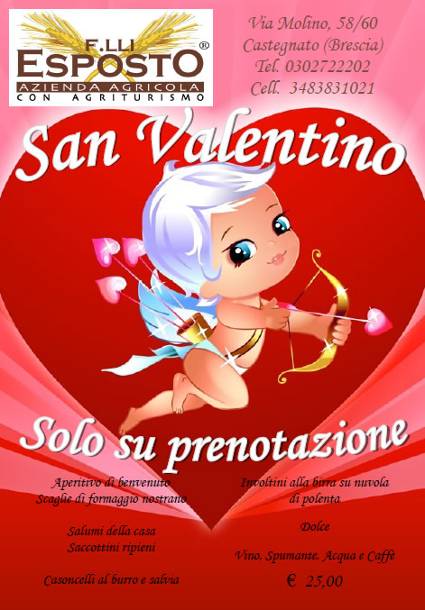 L’Azienda Agricola con Agriturismo F.lli Esposto di Castegnato propone il menù di San Valentino a € 25,00 per sabato 15 e domenica 16 febbraio 2014. Solo su prenotazione