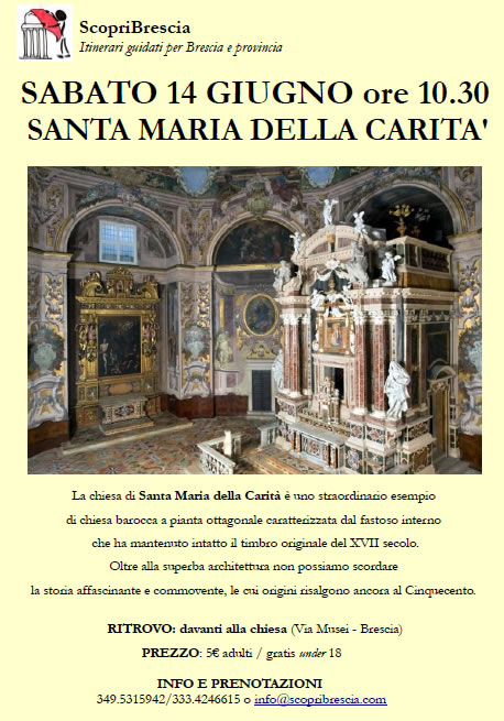 Sabato 14 giugno 2014 alle ore 10.30 le guide turistiche di ScopriBrescia accompagnano i visitatori alla Chiesa di Santa Maria della Carità. Uno straordinario esempio di chiesa barocca a pianta ottagonale caratterizzata dal fastoso interno che ha mantenuto intatto il timbro originale del XVII secolo.