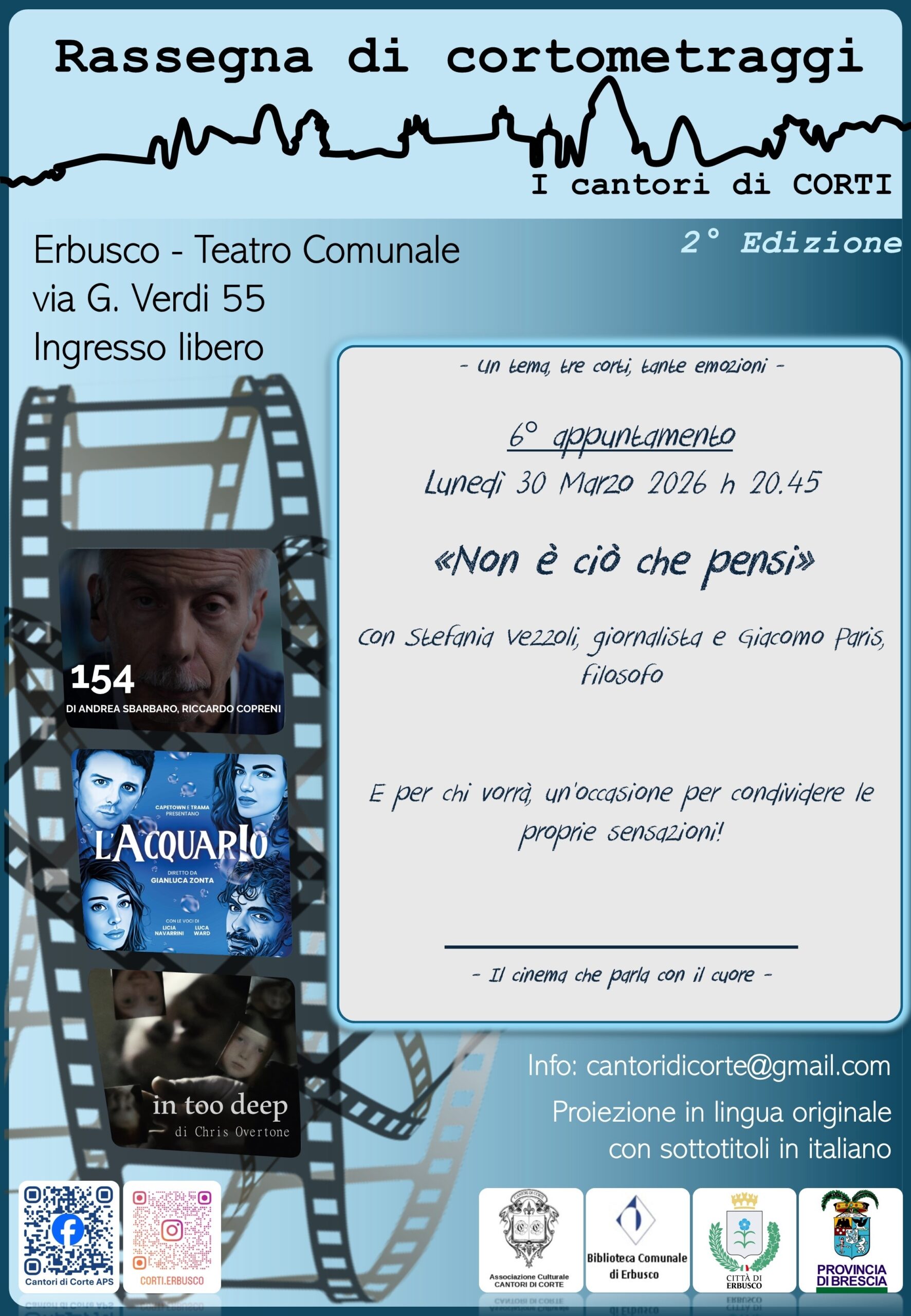 Serata cortometraggi “non è ciò che pensi”. Saranno presentati tre cortometraggi tutti attinenti ad un unico tema. tutti i dettagli riportati in locandina.
