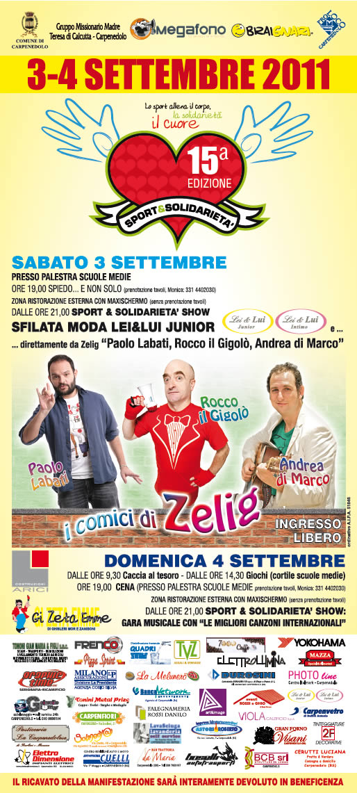 Sabato 3 e domenica 4 settembre si svolgerà la 15a edizione della manifestazione Sport e Solidarietà a Carpenedolo. Un ricco programma di appuntamenti ed eventi tra cui lo spettacolo dei comici di Zelig. Per maggiori informazioni consulta la locandina della manifestazione. Vi aspettiamo numerosi, il ricavato sarà interamente devoluto in beneficenza.