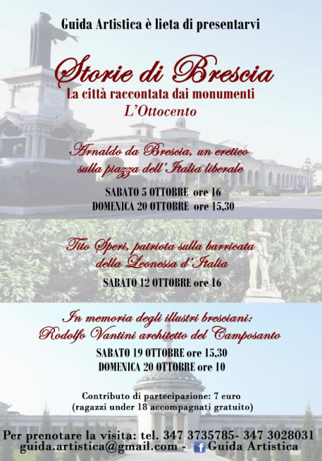 Guida Artistica propone un nuovo ciclo di visite guidate per le prossime settimane intitolato Storie di Brescia la città raccontata dai monumenti che prevede: Sabato 12 Tito Speri, sabato 19 e domenica 20 Rodolfo Vantini e sempre per domenica 20 ottobre Arnaldo da Brescia. Costo biglietti € 7,00 (under 18 accompagnati gratuito)