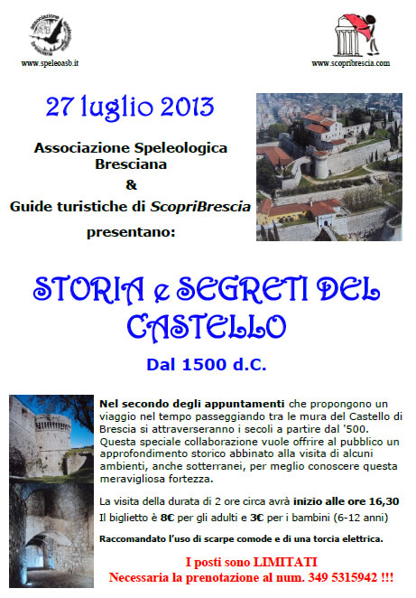 Continuano gli appuntamenti di Storie e Segreti del Castello con ScopriBrescia, nella seconda visita in programma per sabato 27 luglio dalle ore 16.30, si attraversano i secoli a partire dal ‘500. E’ necessaria la prenotazione al numero tel 349 5315942