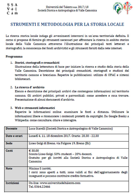 La Società Storica e Antropologica di Valle Camonica in collaborazione con il Liceo Golgi di Breno, propone il corso di approfondimento sul tema: Strumenti e Metodologia per la Storia Locale