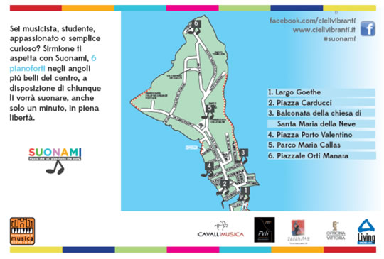 Domenica 9 settembre a Sirmione è in programma Suonami: 7 pianoforti negli angoli più suggestivi del centro, a disposizione di chiunque li vorrà suonare in piena libertà
