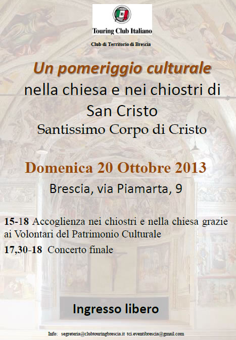 Il Touring Club Italiano propone per domenica 20 ottobre, Un Pomeriggio Culturale con concerto finale, nella chiesa e nei chiostri di San Cristo in via Piamarta 9. Ingresso libero