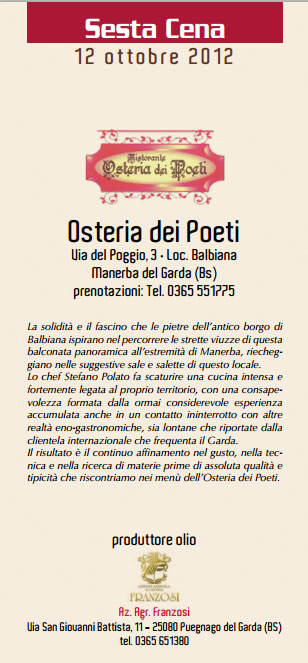 Sesta cena in programma il 12 Ottobre 2012 all’ Osteria dei Poeti Via del Poggio, 3 • Loc. Balbiana Manerba del Garda (Bs) prenotazioni: Tel. 0365 551775
