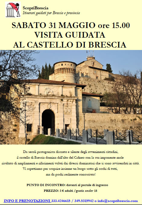 Sabato 31 maggio 2014 alle ore 15.00 le Guide Turistiche di ScopriBrescia propongono una Visita Guidata al Castello di Brescia, da secoli protagonista degli avvenimenti cittadini che con la sua imponente mole domina dall’alto del Cidneo