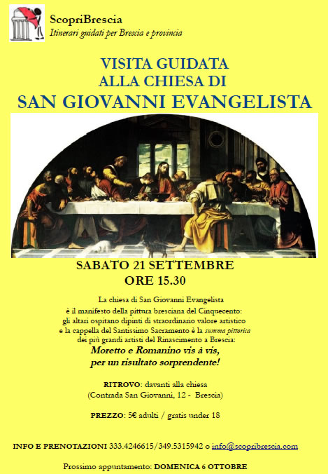 Anche il prossimo week-end sarà ricco di inizative culturali targate ScopriBrescia: Sabato 21 settembre alle ore 15.30 l’appuntamento è alla chiesa di San Giovanni Evangelista, un luogo magico dove contemplare gli straordinari dipinti di Moretto e Romanino: non solo nella celebre cappella del Santissimo Sacramento dove i due grandi bresciani si fronteggiano vis à vis ma anche sugli altari che si susseguono presentando uno straordinario compendio dell’arte rinascimentale bresciana (5 €).