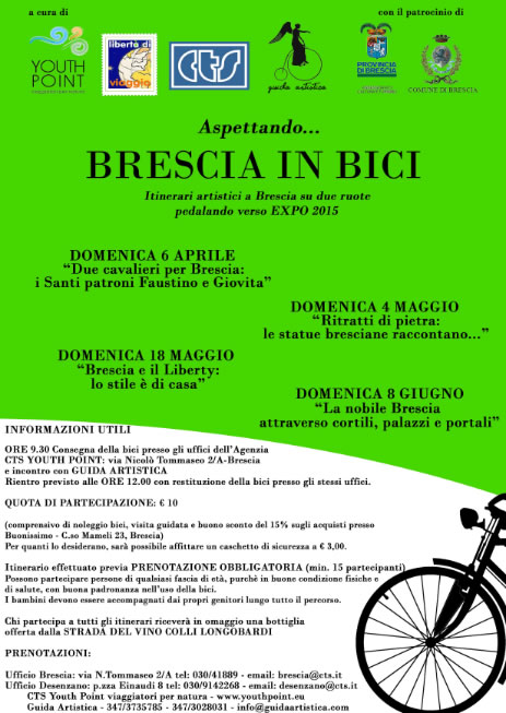 Domenica 8 Giugno ore 9,30 – LA NOBILE BRESCIA ATTRAVERSO CORTILI, PALAZZI E PORTALI. Visita guidata in bicicletta organizzata da Guida Artistica e CTS, per ammirare la città da una prospettiva che solo le due ruote ci possono dare.