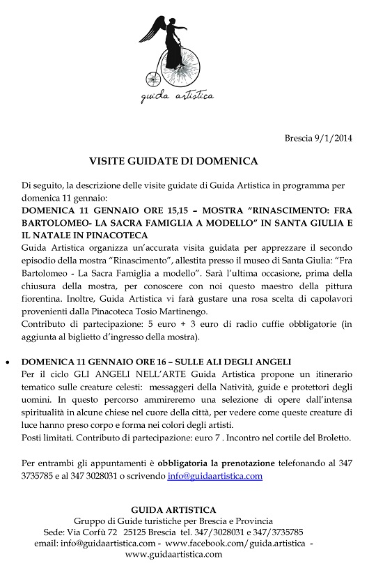 Domenica 11 Gennaio Guida Artistica propone la visita guidata alla mostra “Rinascimento: Fra Bartolomeo – LaSacra Famiglia a Mondello” in Santa Giulia alle ore 16 Sulle Ali degli Angeli